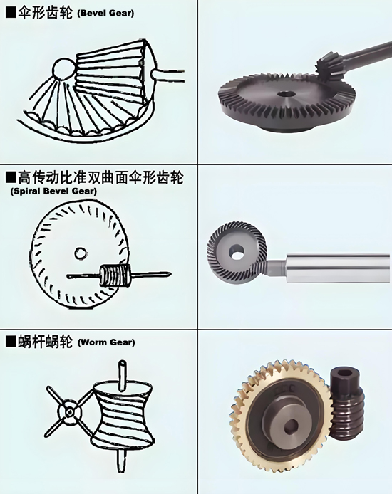 2) Intersecting shaft gears: These include straight bevel gears, spiral bevel gears, and zerol bevel gears.
