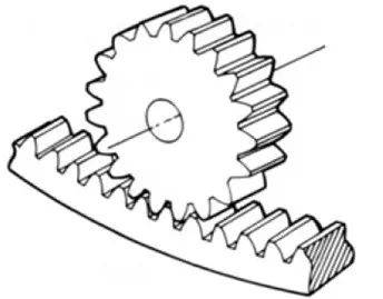 A linear gear that meshes with a spur gear. It can be considered a special case of a spur gear where the pitch circle diameter becomes infinitely large.
