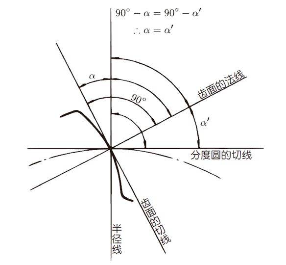 The pressure angle is the angle between the radius line and the tangent to the gear tooth profile at a specific point (usually the pitch point). As shown in the diagram, α represents the pressure angle. Since α' = α, α' is also considered the pressure angle.