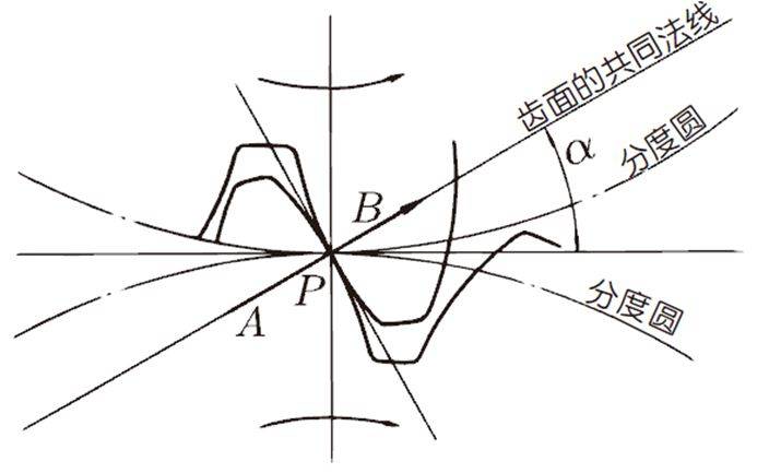 When observing the meshing state of gear A and gear B from the node, gear A applies force to gear B at the node. At this moment, the applied force acts along the common normal of gears A and B. In other words, the common normal is the direction of the force application and also the direction of pressure. The angle α is the pressure angle.