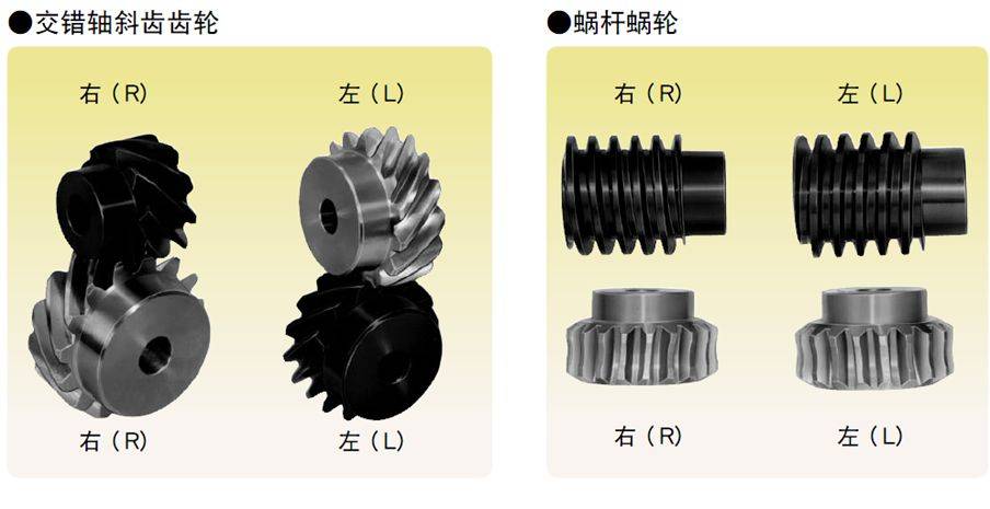For helical gears, spiral bevel gears, and other gears with helical teeth, the direction of the helix and the way they mate are fixed. The helical direction refers to the direction of the gear teeth when the center axis of the gear is oriented vertically. When viewed from the front, teeth pointing towards the upper right are classified as [right-handed], and those pointing towards the upper left are [left-handed]. The mating configurations for various gears are as follows: