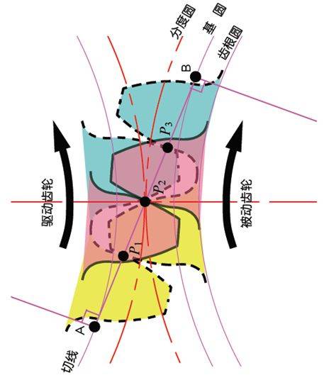 The meshing contact points of two gear tooth shapes move on the meshing line in the order of P1-P2-P3