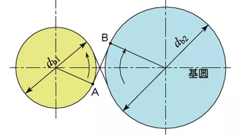 The common tangent to the base circles A—B is called the line of action. All meshing points of the gears lie on this line.
