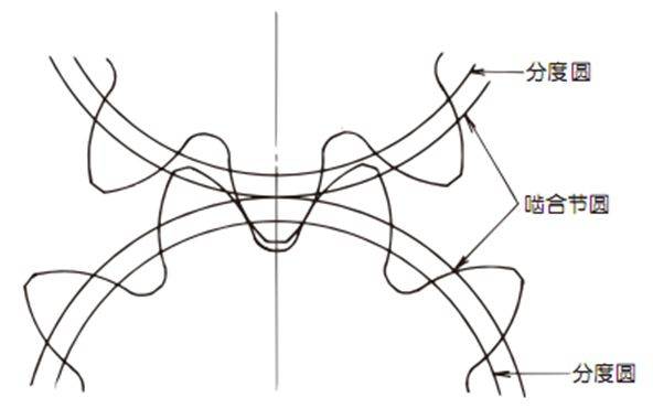Two standard involute gears mesh at the pitch circles, which are tangent to each other at the standard center distance.