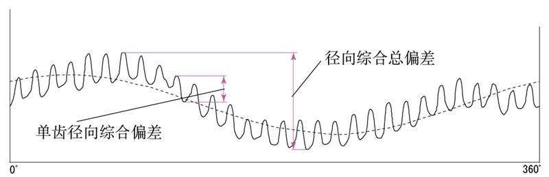 So far, we have described methods for evaluating the accuracy of individual gears, such as tooth profile, tooth pitch, and tooth line accuracy. In contrast, there is also a method for evaluating gear accuracy through two-tooth meshing tests after the gear is meshed with a measuring gear. The measured gear's left and right tooth surfaces mesh with the measuring gear and rotate through a full revolution. Changes in the center distance are recorded. The figure below shows the test results for a gear with 30 teeth. The waveform of the single-tooth radial composite deviation has 30 waves. The radial composite total deviation is approximately the sum of the radial runout deviation and the single-tooth radial composite deviation.